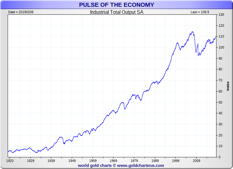 Industrial total output since 1919 (Barron's); The date chosen for index=100 is different than in the previous chart;