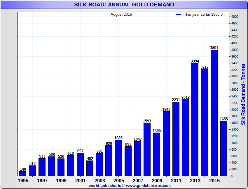 1a: Non-Western Central Banks (RoW) have been increasing their holdings of gold at a very rapid pace, going from 6,300 tonnes in Q1 2009 to more than 8,200 tonnes at the end of Q1 2013 (source)